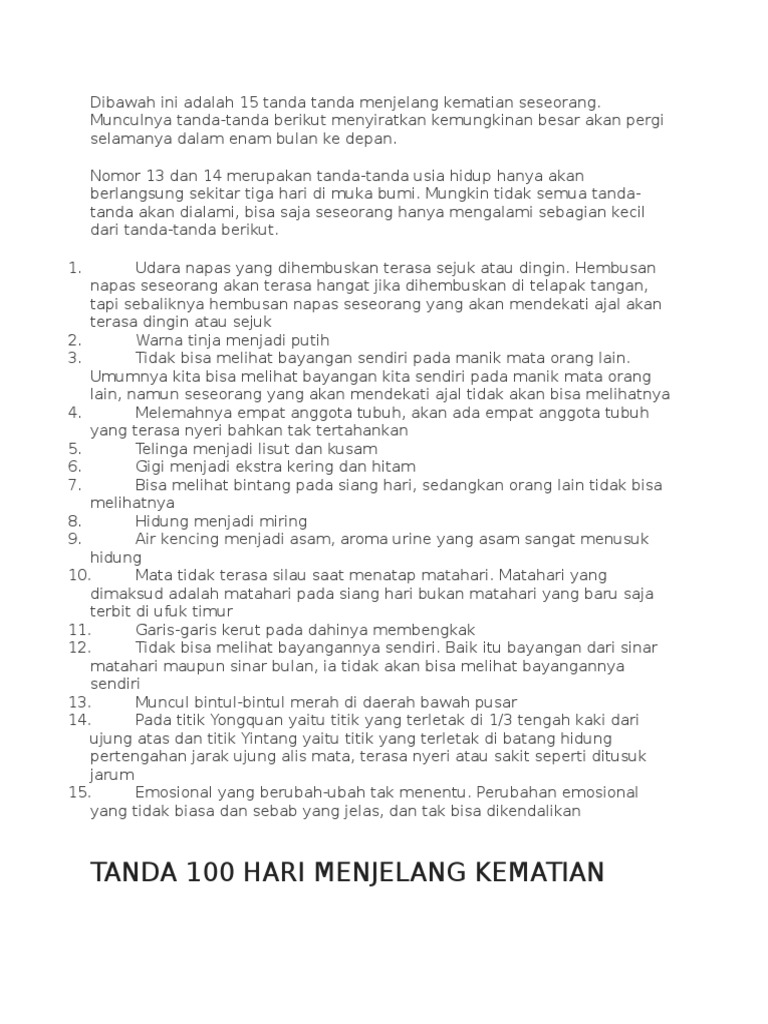 Kematian seratus hari sebelum ajal. Tanda dekatnya kematian seseorang bisa dilihat dari nafasnya. Posted on ogos 5, 2010 by sifuli. Itu berarti sirkulasi darah di tempat seperti tangan, kaki, dan kaki anda sangat berkurang. Pembengkakan di kaki dan pergelangan kaki pun tak terhindarkan.